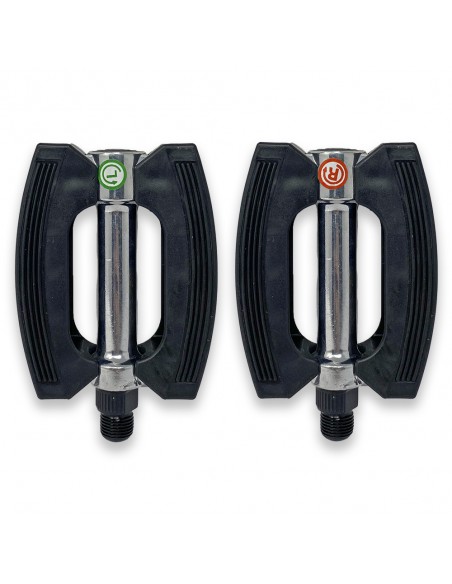 Ogni pedale è chiaramente identificato con un segno distintivo (verde per sinistro, rosso per destro) che facilita un montaggio rapido e corretto, evitando errori di installazione.