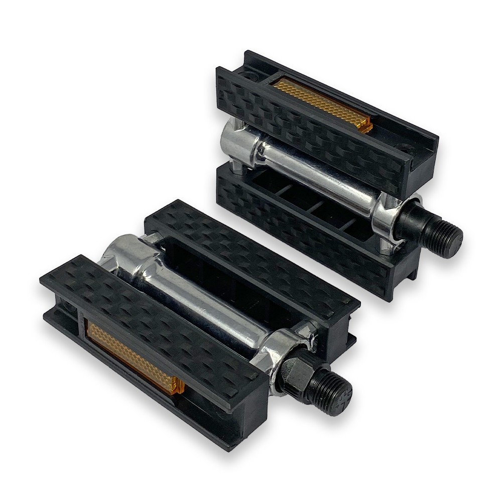 Questi pedali per bici vintage con catarifrangenti non sono solo un elemento estetico, ma anche un accessorio pratico e affidabile. Perfetti per chi ama le linee pulite, le geometrie simmetriche e l’essenzialità del design retrò, senza rinunciare alla sicurezza e alla compatibilità con componenti attuali.