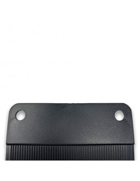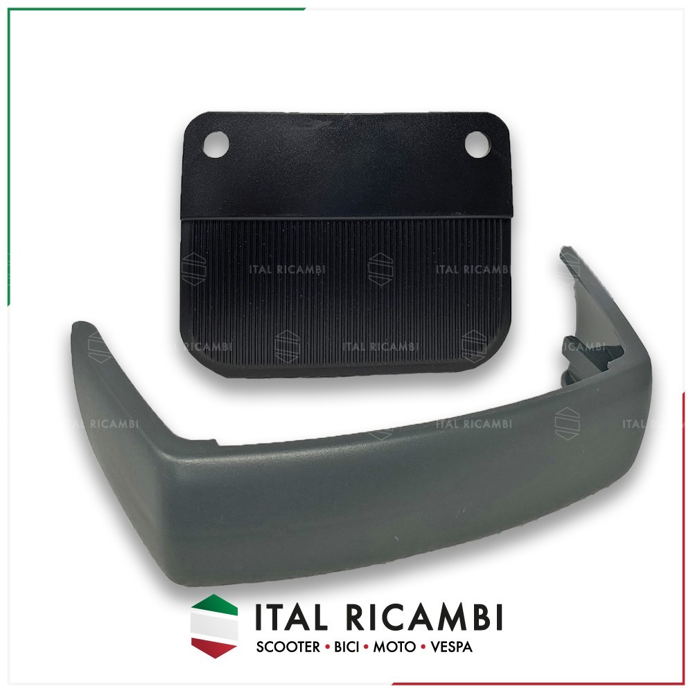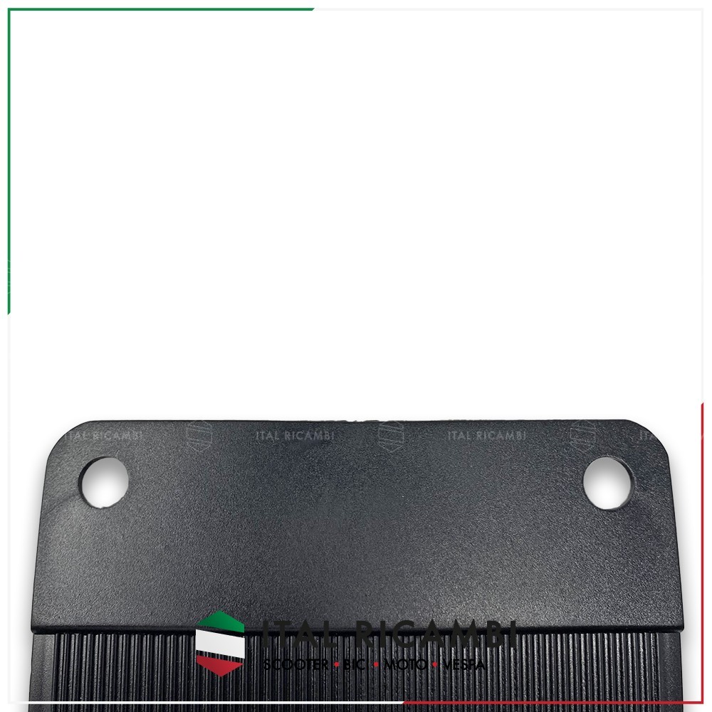 La struttura principale è realizzata in plastica rigida grigia, modellata per seguire con precisione le linee del parafango della Vespa PK, assicurando un’installazione pulita e precisa. Nella parte inferiore è fissata una gomma nera flessibile, robusta e resistente, progettata per contenere efficacemente gli schizzi. La superficie della gomma presenta una zigrinatura verticale che favorisce lo scolo dei liquidi, contribuendo a una maggiore durata del componente nel tempo.