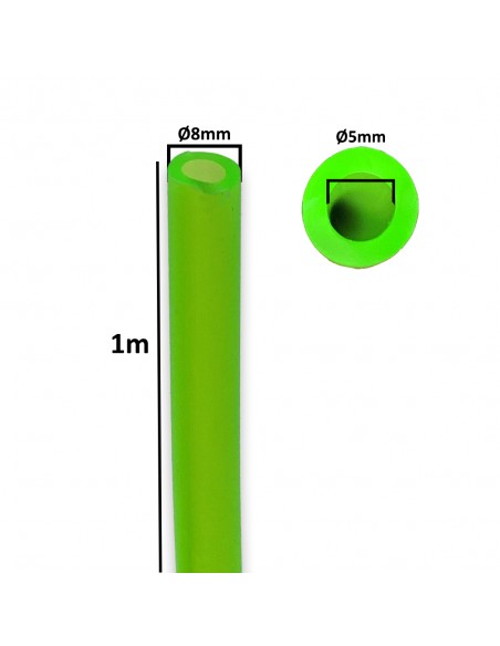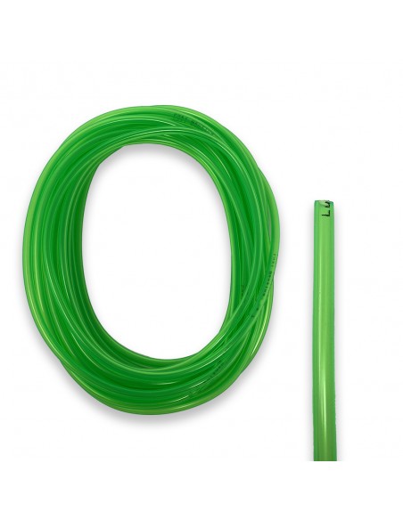 Tubo benzina in gomma resistente, colore verde trasparente, diametro interno Ø 5mm e diametro esterno Ø 8 mm.