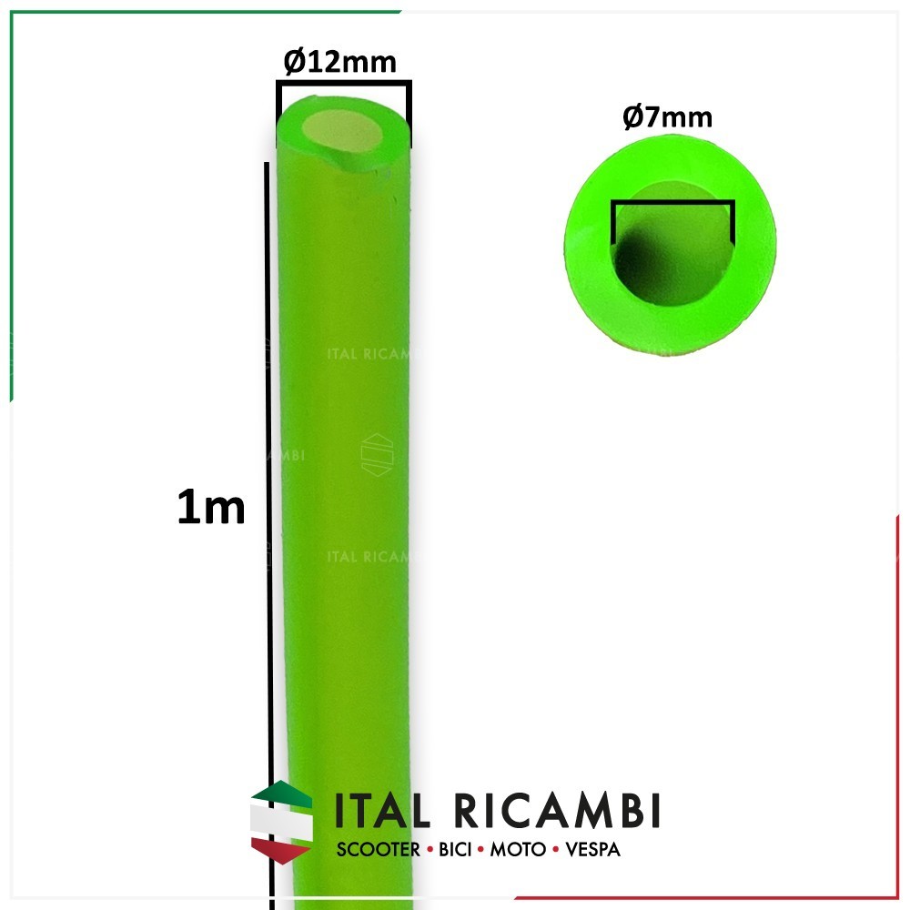 Tubo benzina in gomma resistente, colore verde trasparente, diametro interno Ø 7mm e diametro esterno Ø 12mm.